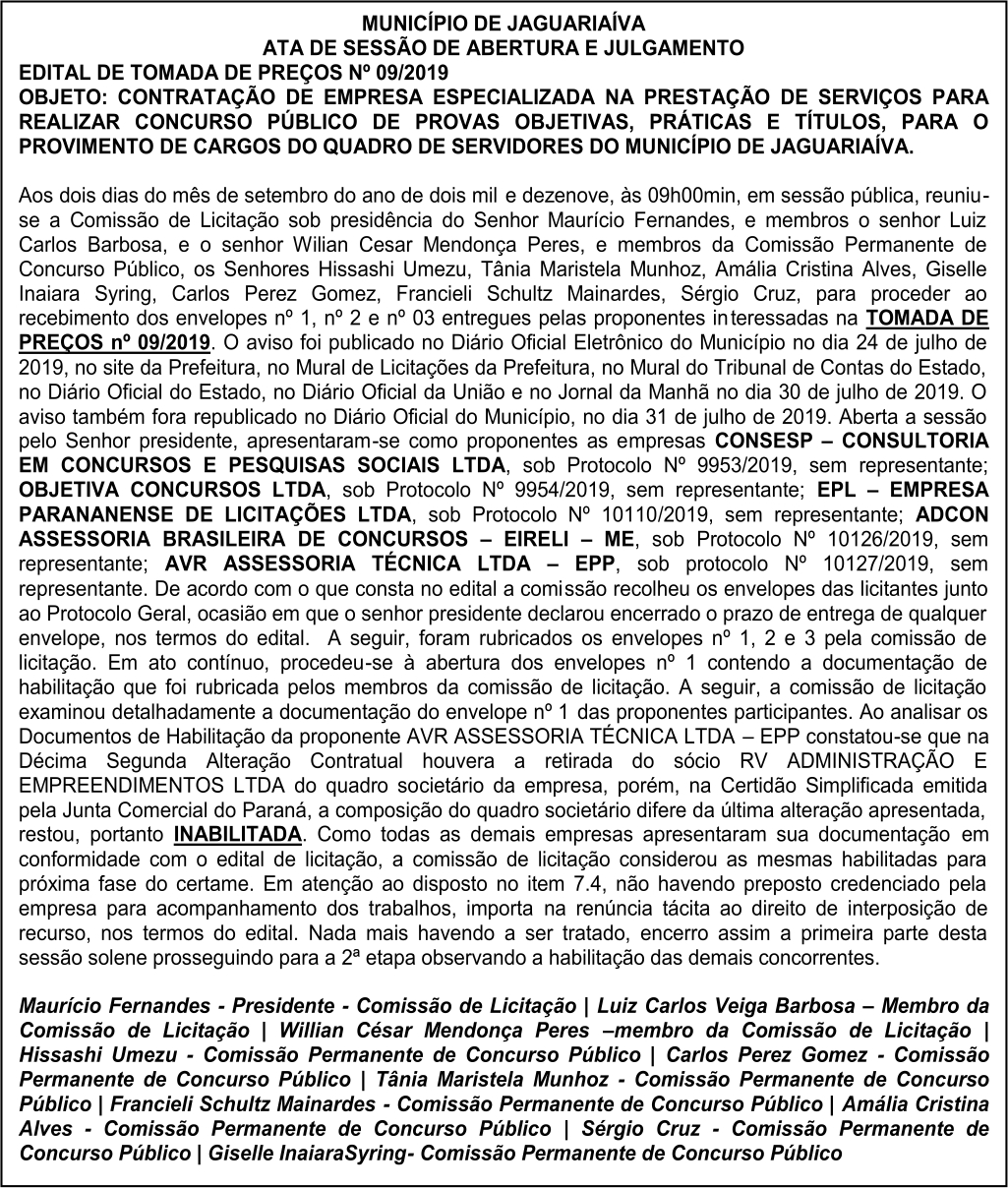 Ata de Sessão de Abertura e Julgamento de Licitação Tomada de Preços N° 09/2019 – 1ª Parte