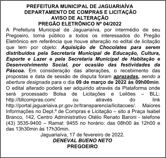 Aviso de Alteração de Licitação Pregão Eletrônico Nº 04/2022