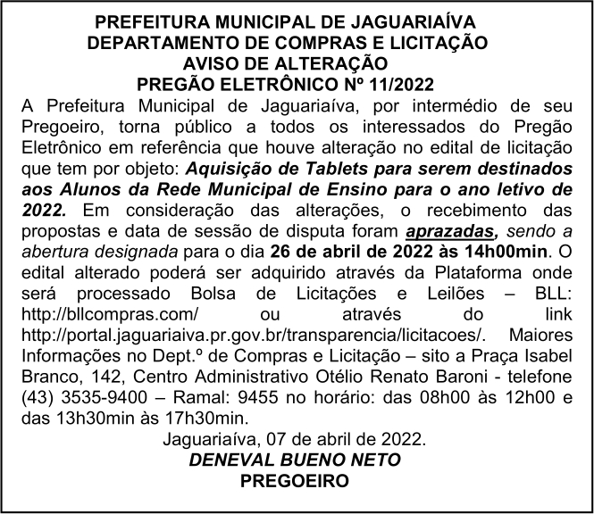 Aviso de Alteração de Licitação Pregão Eletrônico Nº 11/2022