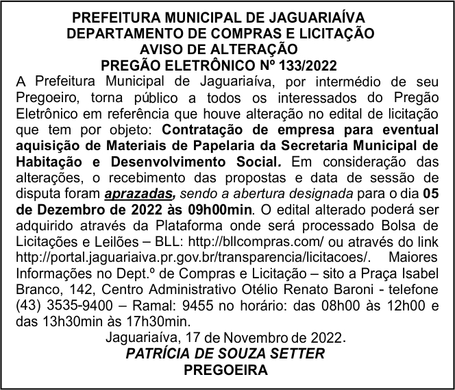 Aviso de Alteração de Licitação Pregão Eletrônico Nº 133/2022