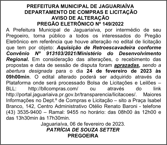 Aviso de Alteração de Licitação Pregão Eletrônico Nº 149/2022