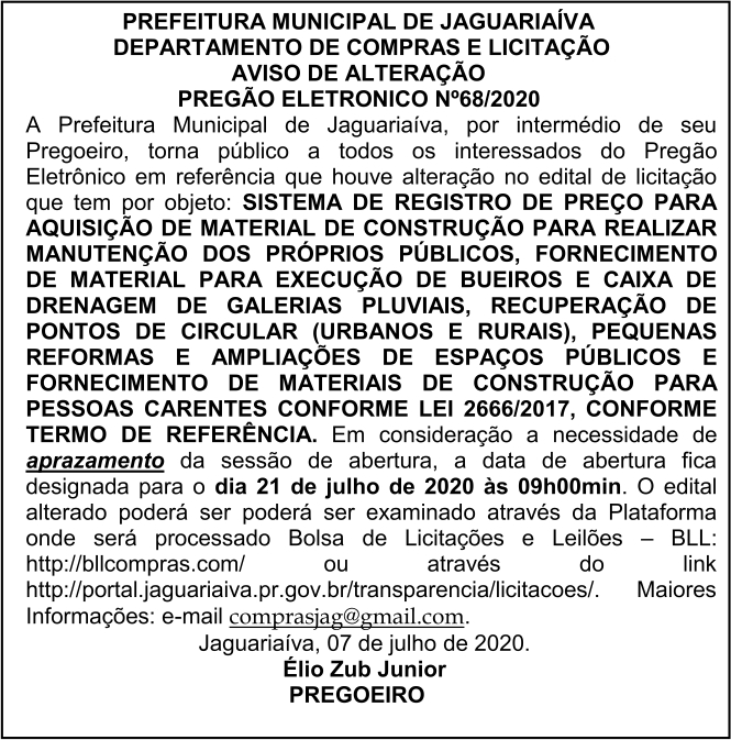 Aviso de Alteração de Licitação Pregão Eletrônico Nº 68/2020