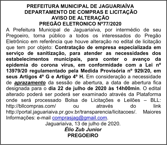 Aviso de Alteração de Licitação Pregão Eletrônico Nº 77/2020