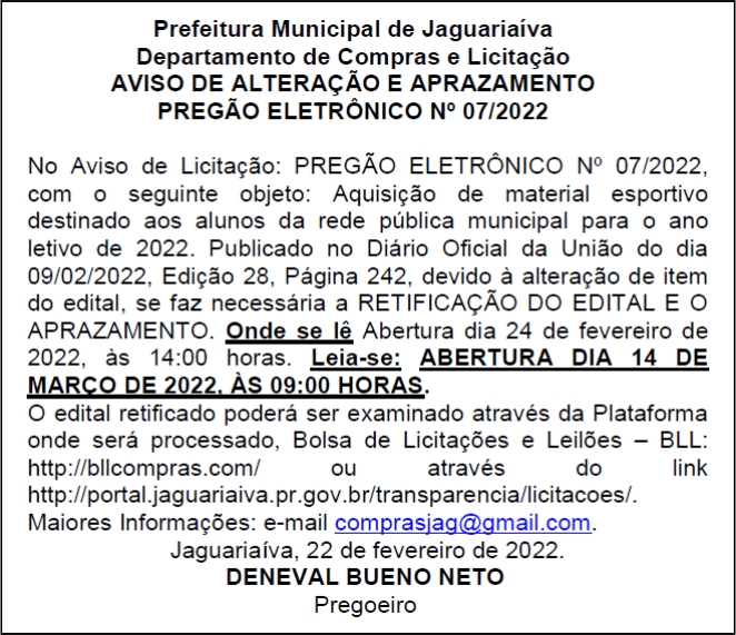 Aviso de Alteração e Aprazamento de Licitação Pregão Eletrônico Nº 07/2022