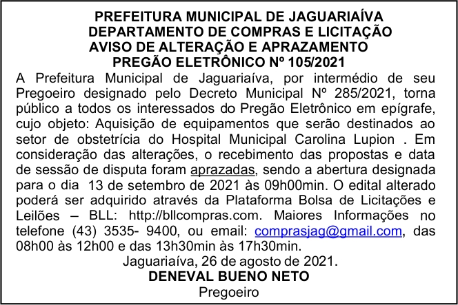 Aviso de Alteração e Aprazamento de Licitação Pregão Eletrônico Nº 105/2021