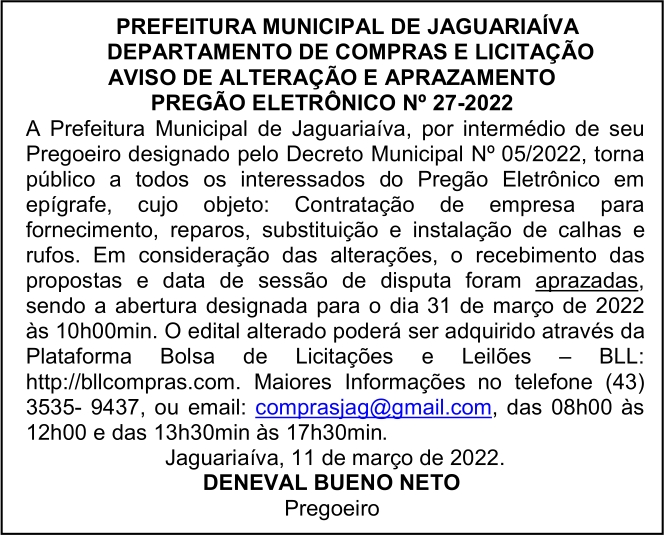Aviso de Alteração e Aprazamento de Licitação Pregão Eletrônico Nº 27/2022