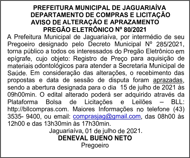 Aviso de Alteração e Aprazamento de Licitação Pregão Eletrônico Nº 80/2021