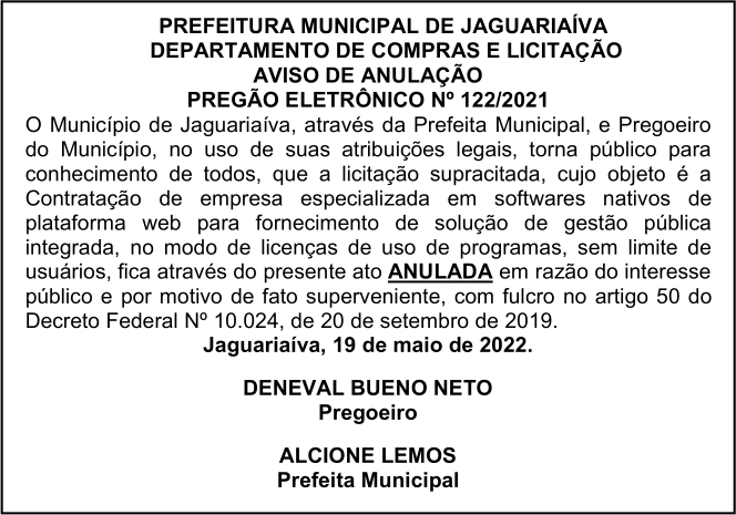 Aviso de Anulação de Licitação Pregão Eletrônico Nº 122/2021