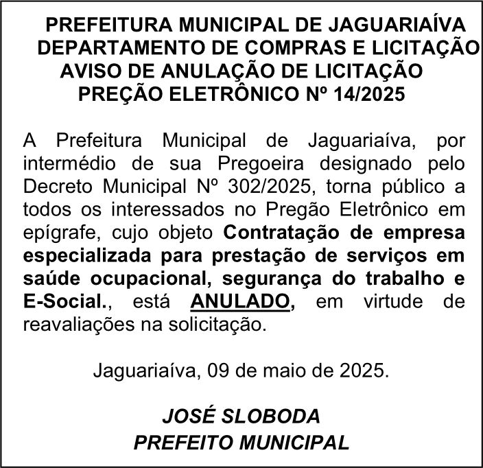 Aviso de Anulação De Licitação Pregão Eletrônico Nº 14/2025