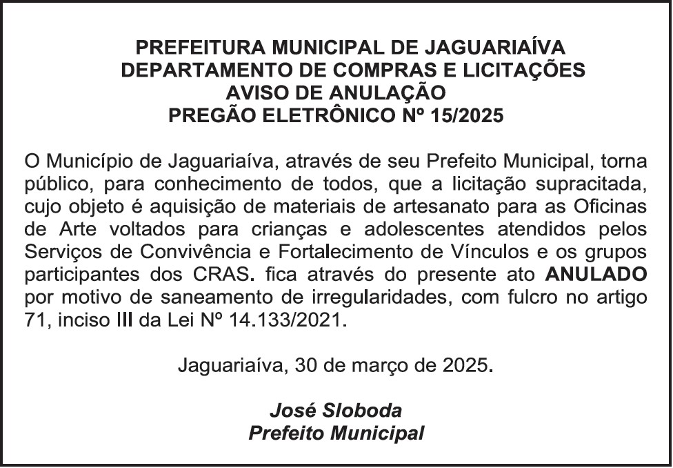 Aviso de Anulação de Licitação Pregão Eletrônico Nº 15/2025
