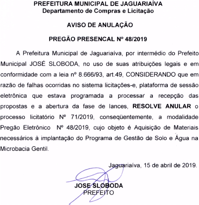 Aviso de Anulação de Licitação Pregão Eletrônico Nº 48/2019