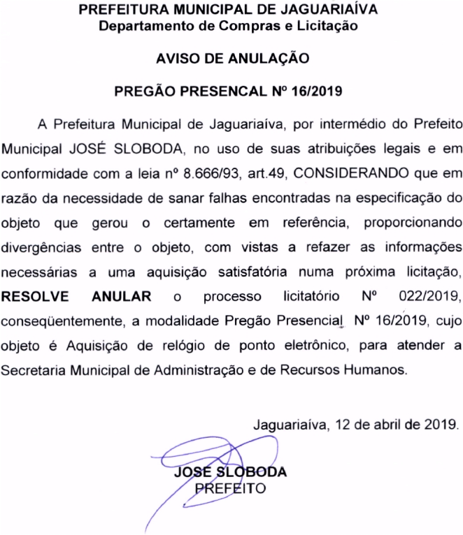 Aviso de Anulação de Licitação Pregão Presencial Nº 16/2019
