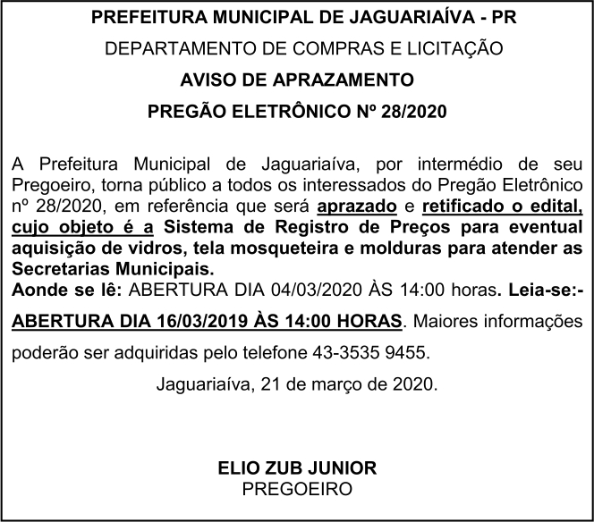 Aviso de Aprazamento de Licitação Pregão Eletrônico Nº 28/2020