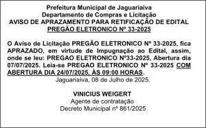 Aviso de Aprazamento de Licitação Pregão Eletrônico Nº 33/2025