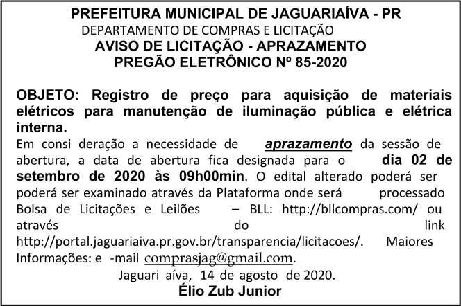Aviso de Aprazamento de Licitação Pregão Eletrônico Nº 85/2020