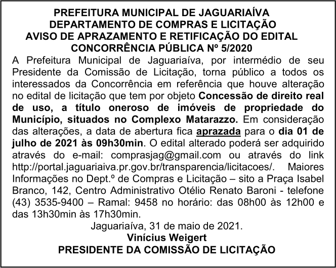 Aviso de Aprazamento e Retificação Concorrência Pública Nº 05/2020