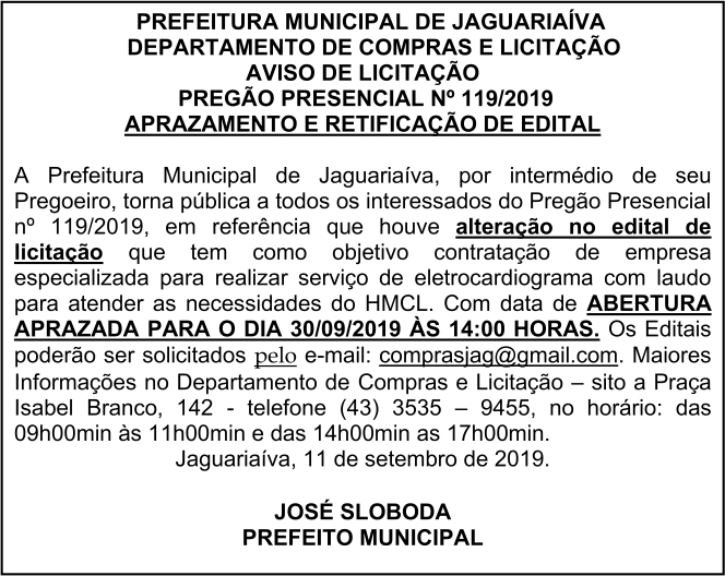 Aviso de Aprazamento e Retificação de Licitação Pregão Presencial Nº 119/2019