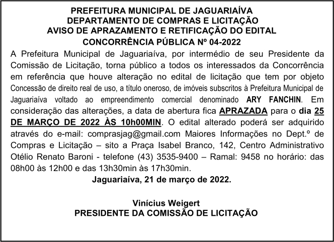 Aviso de Aprazamento e Retificação do Edital Concorrência Pública Nº 04/2022