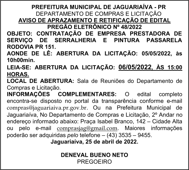 Aviso de Aprazamento e Retificação do Edital Pregão Eletrônico Nº 48/2022