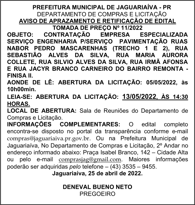 Aviso de Aprazamento e Retificação do Edital Tomada de Preços Nº 11/2022