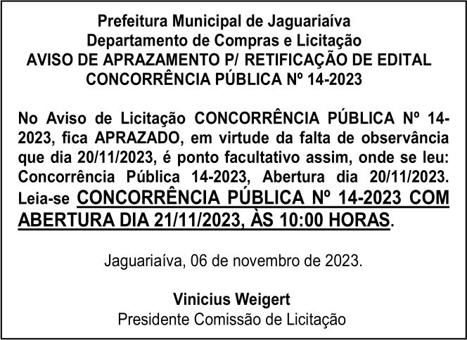Aviso de aprazamento p/ retificação de edital de concorrência pública Nº14 – 2023