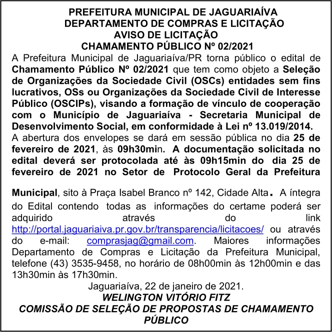 Aviso de Chamamento Público Nº 02/2021