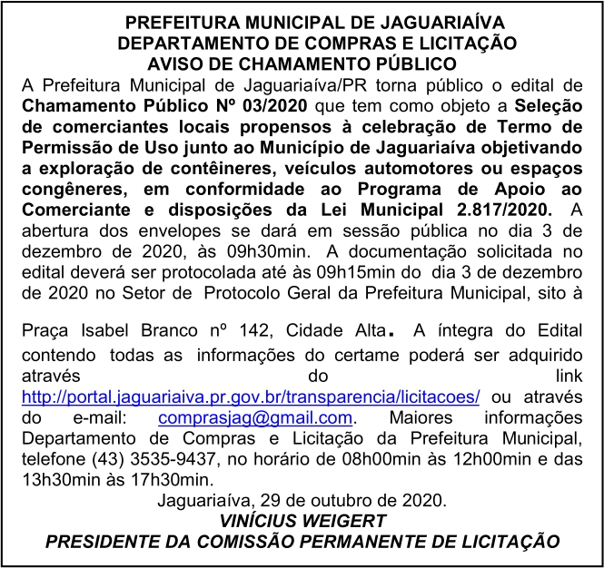 Aviso de Chamamento Público Nº 03/2020