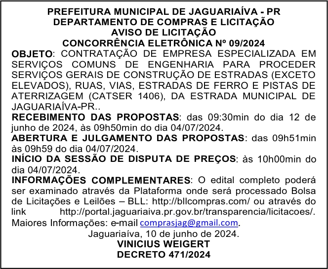 Aviso de Licitação Concorrência Eletrônica Nº 09/2024