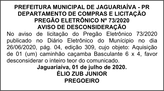 Aviso de Desconsideração de Aviso de Licitação Pregão Eletrônico Nº 73/2020
