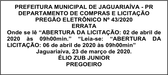 Aviso de Errata Pregão Eletrônico Nº 43/2020