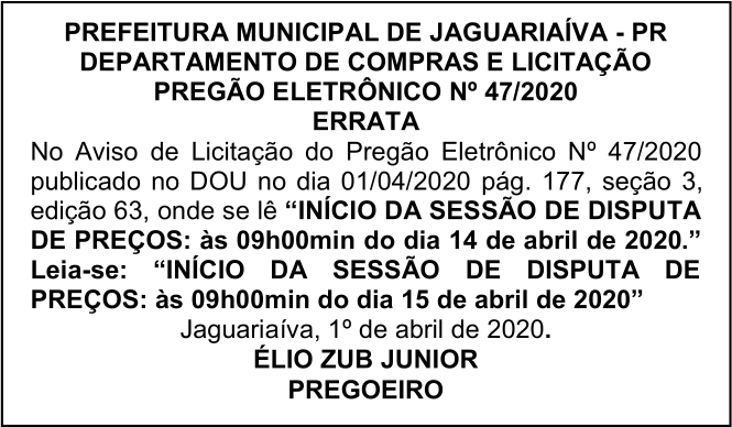 Aviso de Errata Pregão Eletrônico Nº 47/2020