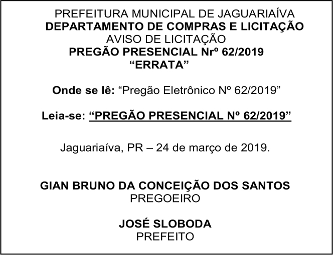 Aviso de Errata Pregão Presencial Nº 62/2019