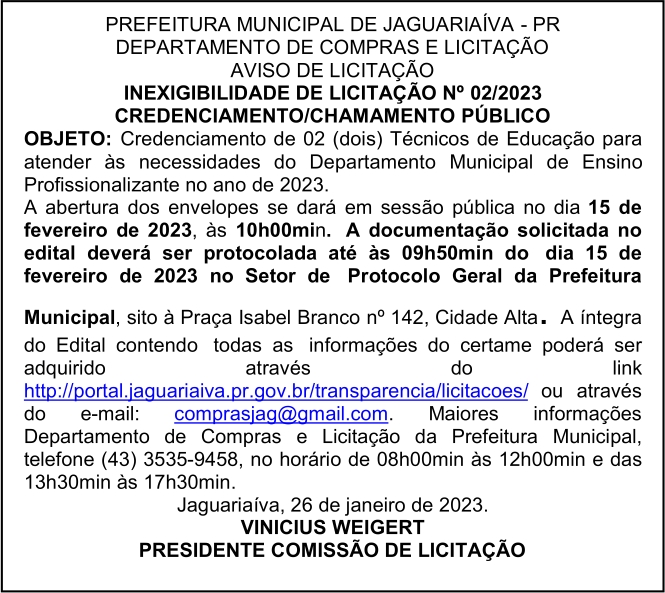 Aviso de Inexigibilidade de Licitação Credenciamento/Chamamento Público Nº 02/2023