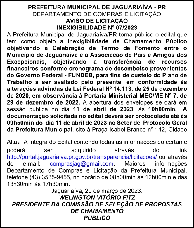 Aviso de Inexigibilidade de Licitação Nº 07/2023