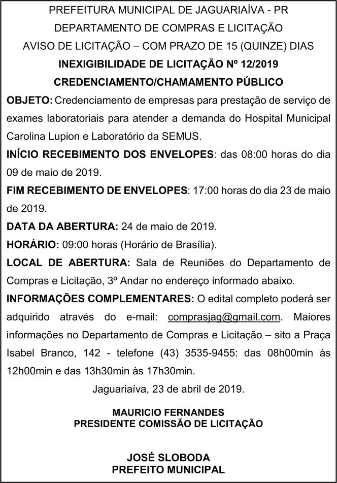 Aviso de Inexigibilidade de Licitação Nº 12/2019
