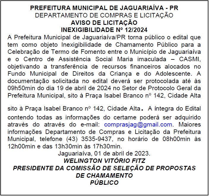 Aviso de Inexigibilidade de Licitação Nº 12/2024