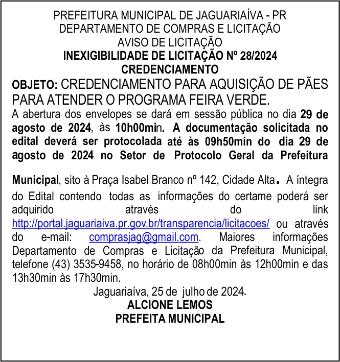 Aviso de Inexigibilidade de Licitação Nº 28/2024
