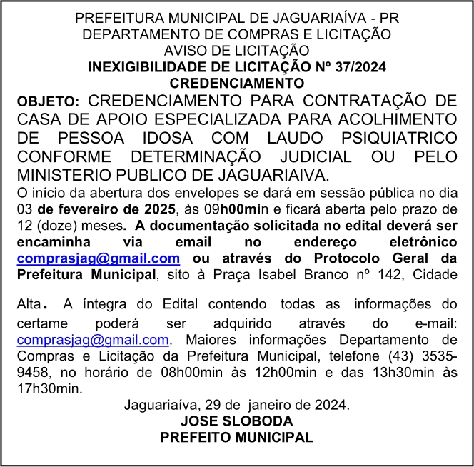 Aviso de Inexigibilidade de Licitação Nº 37/2024 – Credenciamento