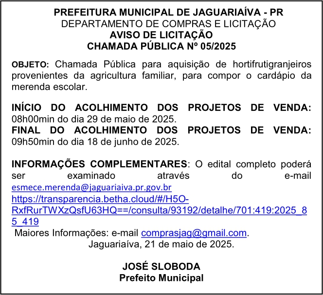 Aviso de Licitação Chamada Pública Nº 05/2025