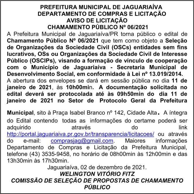 Aviso de Licitação Chamamento Público Nº 06/2021