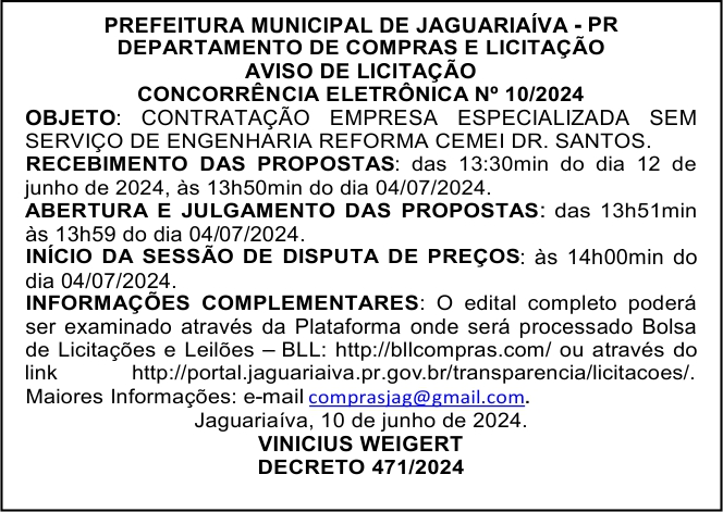 Aviso de Licitação Concorrência Eletrônica Nº 10/2024
