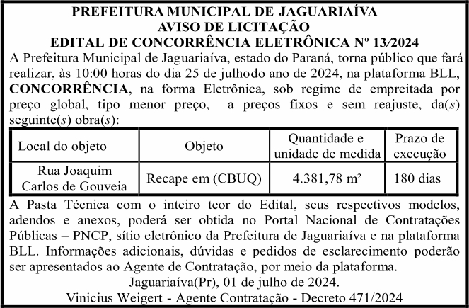 Aviso de Licitação Concorrência Eletrônica Nº 13/2024