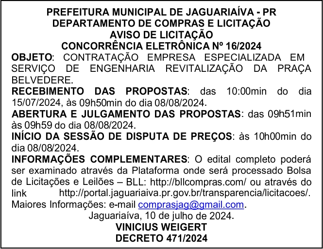 Aviso de Licitação Concorrência Eletrônica Nº 16/2024