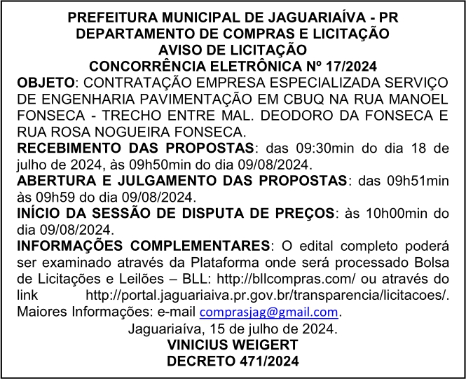 Aviso de Licitação Concorrência Eletrônica Nº 17/2024