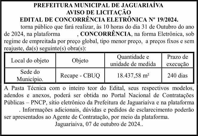 Aviso de Licitação Concorrência Eletrônica Nº 19/2024