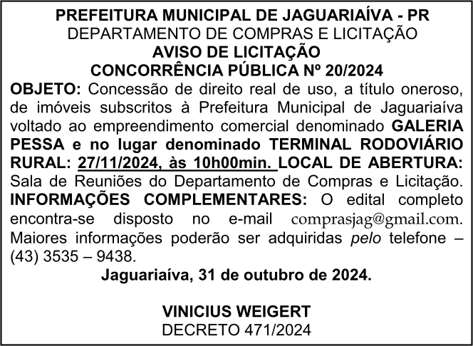 Aviso de Licitação Concorrência Eletrônica Nº 20/2024