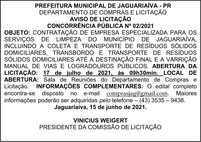 Aviso de Licitação Concorrência Pública Nº 02/2021
