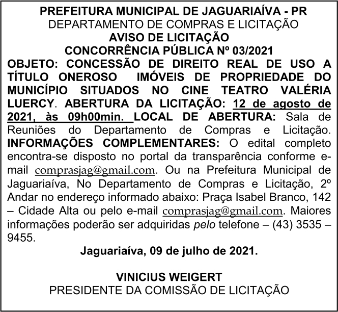 Aviso de Licitação Concorrência Pública Nº 03/2021