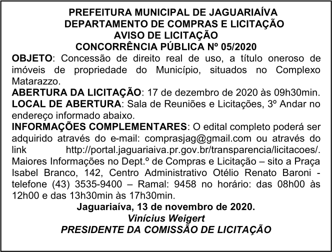 Aviso de Licitação Concorrência Pública Nº 05/2020