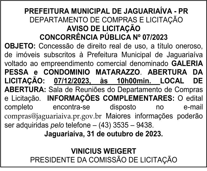 Aviso de Licitação Concorrência Pública Nº 07/2023